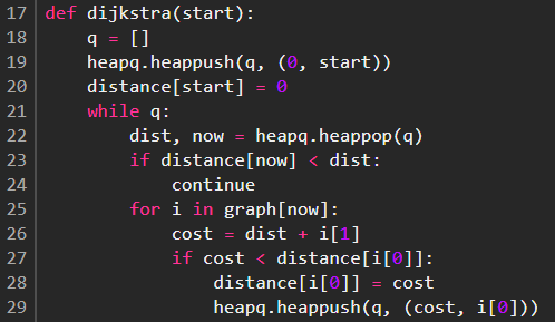 25~29번째 줄에서 탐색할 노드를 BFS식으로 탐색하며 현재 노드를 거쳐 다른 노드로 이동하는 거리가 distance 배열에 담겨있는 값보다 더 짧은 경우 distance 배열 및 탐색할 (거리, 노드)를 담는 q를 갱신하게 된다