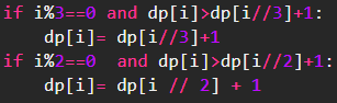 그러므로 만약 계산하고자 하는 숫자가 3으로 나누어지고 현재값이 dp[i//3]+1보다 크다면 값을 바꿔준다